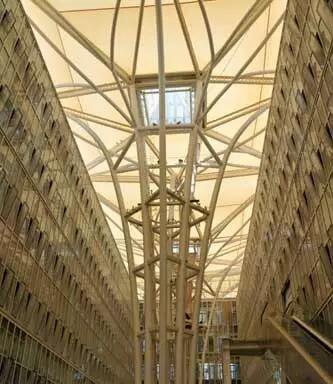 北京国际花卉物流港花伞结构下部的密闭空间构成了场馆的中庭,中庭利用环保节能的建筑设计理念和高科技材料,起到了局部气候调节的作用,可使场馆内部空间保持冬暖夏凉,被称之为"不用电的中央空调",具备通风换气和调节温度两大功能。